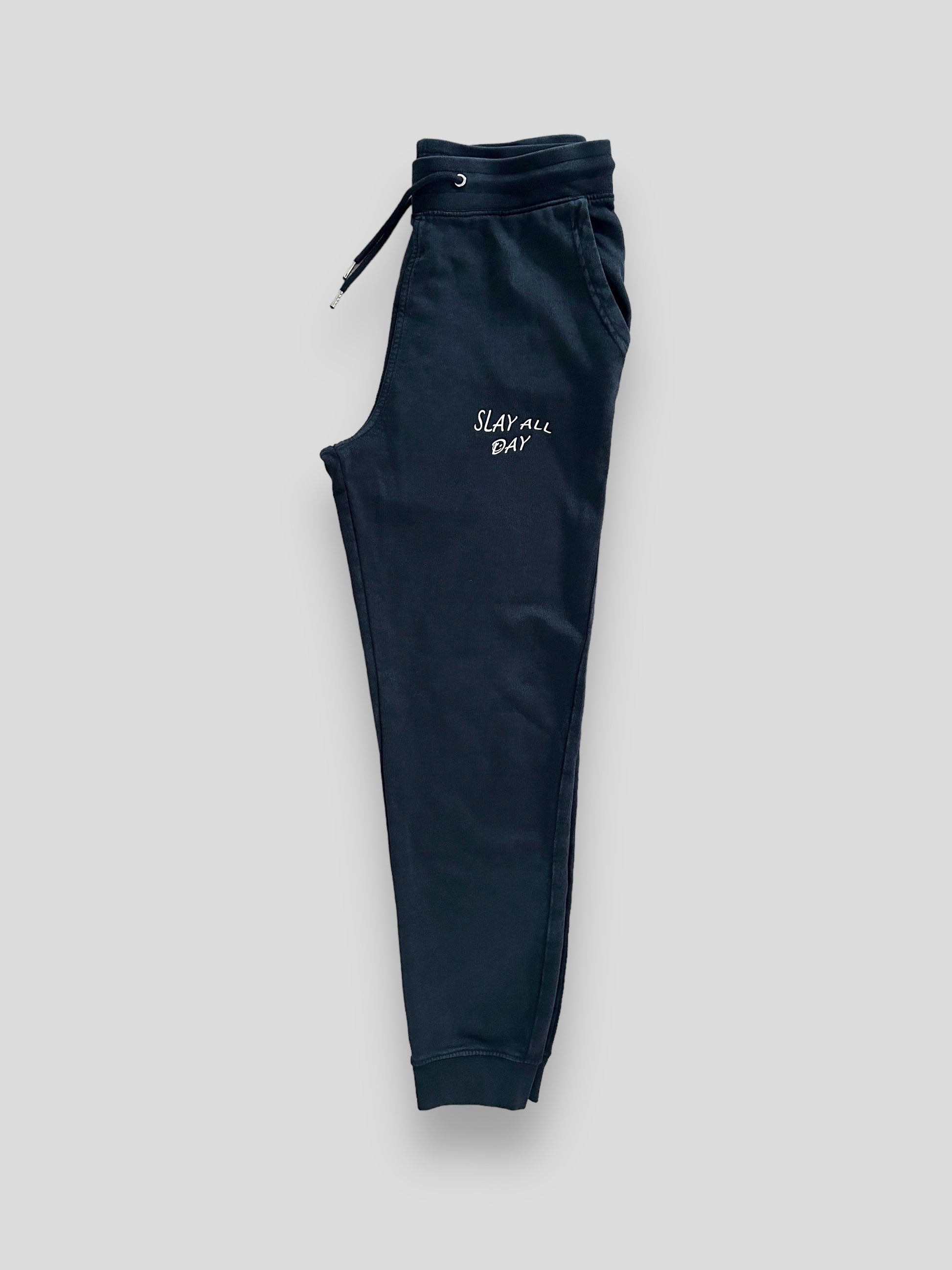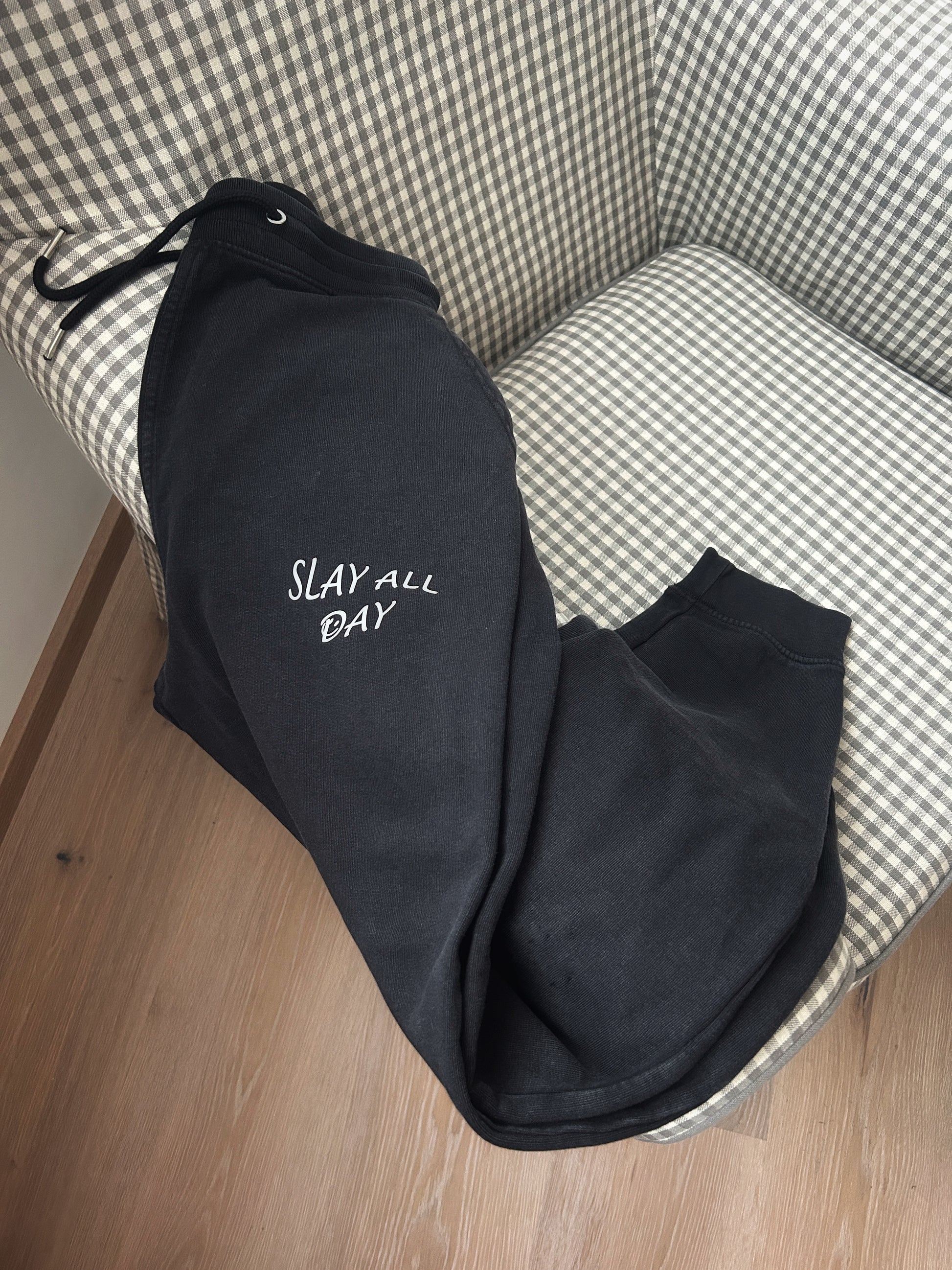Fair hergestellte, schwarze Jogginghose ' SLAY ALL DAY ' mit weißem Flex-Printaufdruck