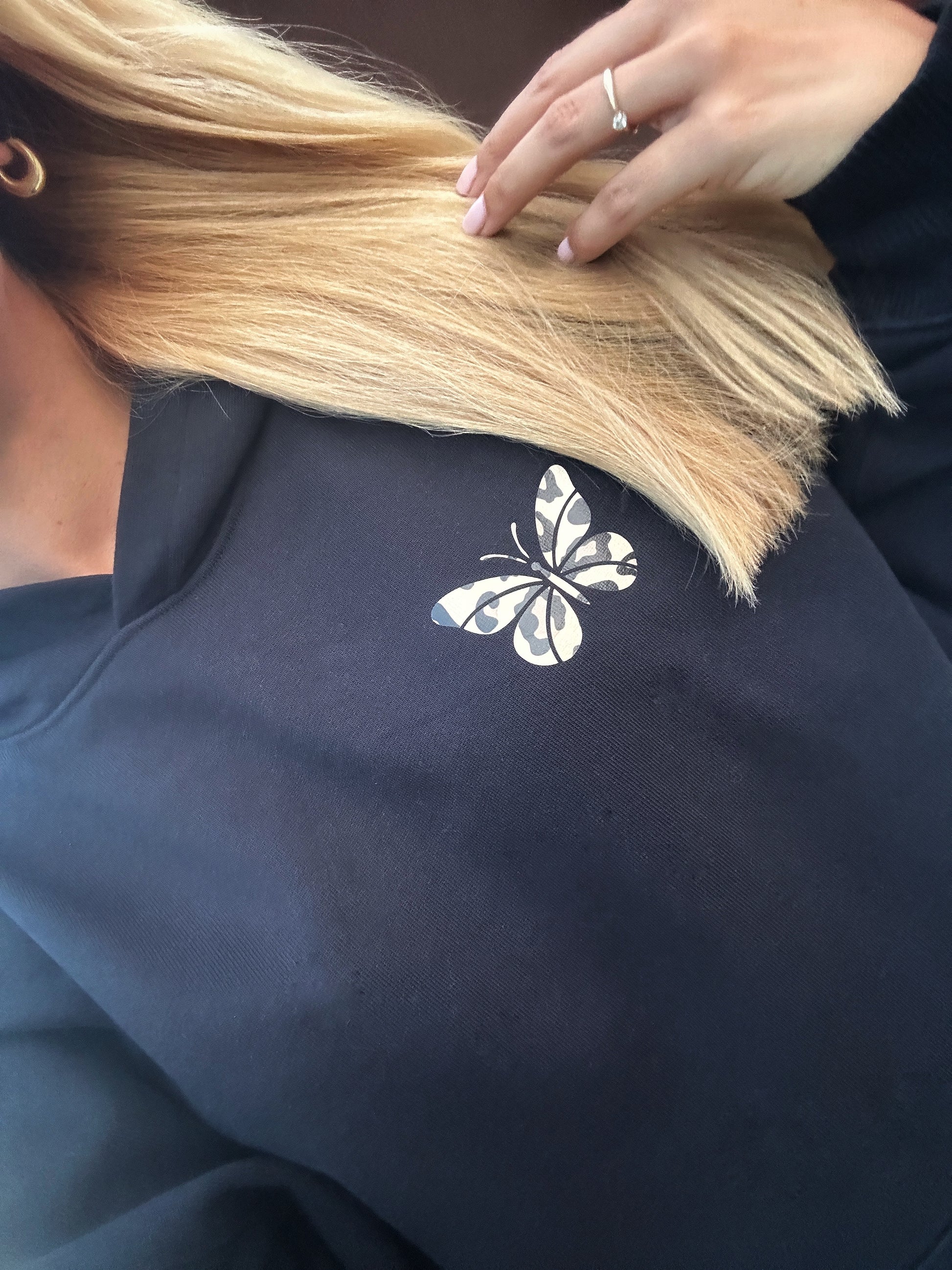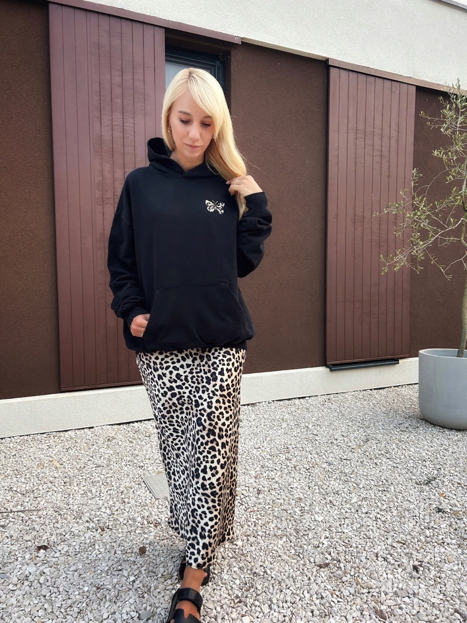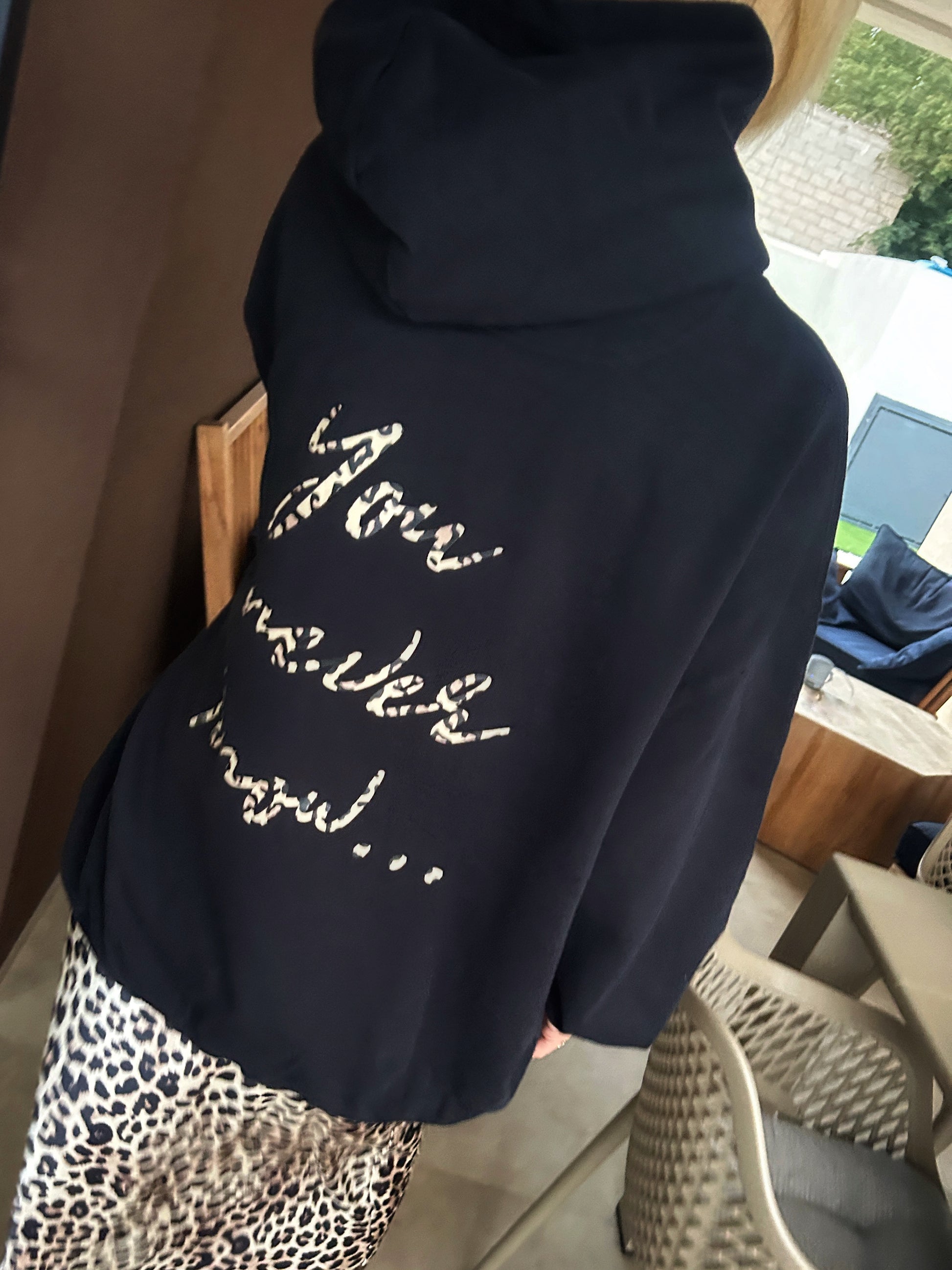 - Design: Der Hoodie besticht durch seine lockere Passform und die doppellagige Kapuze mit Futter aus Oberstoff. Auf der Vorderseite befindet sich ein dezenter Schmetterlings-Print, während der Rücken mit dem Statement "You never know..." in einem stilvollen Leopardenmuster verziert ist.